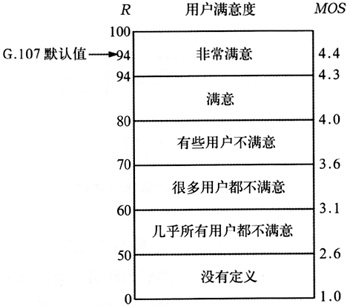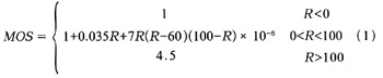 。5)MOS值,MOS模型是主觀評(píng)價(jià)方法,根據(jù)E模型MOS值是通過(guò)R值計(jì)算得到的。MOS值是1~5之間的數(shù),1是最差的,5是最好的[6]。R和MOS值的關(guān)系式如下所示:
