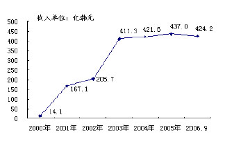 經(jīng)過6年多的運(yùn)營,韓國電信的eBilling業(yè)務(wù)發(fā)展良好,目前與其合作的ICP已達(dá)到500多家,內(nèi)容涵蓋了收費(fèi)郵箱、在線軟件銷售、聊天、娛樂、游戲、漫畫、綜合信息等;業(yè)務(wù)收入也逐年上升,從2000年的14.1億韓元(折合人民幣0.11億元)增長(zhǎng)到2006年9月份的424.2億韓元(折合人民幣3.3億元),如圖2、圖3所示。