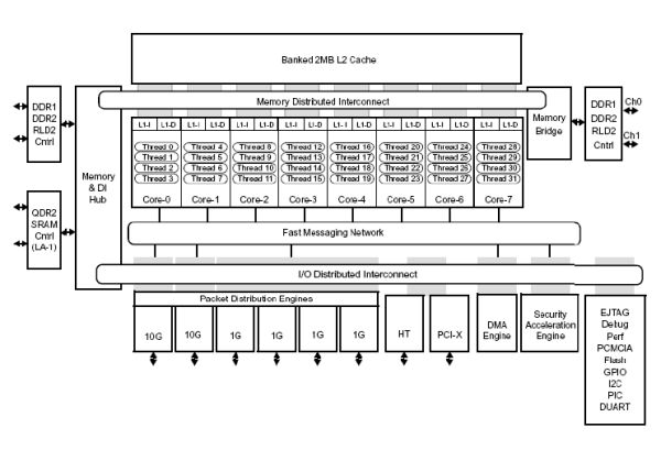 今年以來,RISC多核處理器在網(wǎng)絡設備的應用加速,我們注意到另一家智能網(wǎng)絡用多核處理器供應商Cavium Networks公司也宣布推出了多核網(wǎng)絡處理器OCTEON產(chǎn)品系列,該系列由1到16個基于MIPS64技術的cnMIPS內(nèi)核構(gòu)成,能夠在單一芯片上提供高達16GHz的64位計算處理能力。此外,OCTEON還采用了最先進的多層次應用加速技術,用于支持網(wǎng)絡控制、數(shù)據(jù)和服務應用等。OCTEON處理器產(chǎn)品系列集成了多達8個Gigabit端口、雙SPI-4.2、PCI-X、高達144-bit的DDR2控制器、雙8-bit