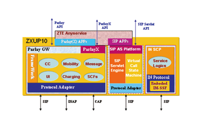 ZXUP10作為開放業(yè)務(wù)平臺,包括Parlay網(wǎng)關(guān)和SIP應(yīng)用平臺,對外提供標(biāo)準(zhǔn)的Parlay/ParlayXAPI和SIPServletAPI,屏蔽底層網(wǎng)絡(luò)的差異性,第三方通過調(diào)用標(biāo)準(zhǔn)接口,快速生成Web等方式的第三方應(yīng)用,帶來業(yè)務(wù)開發(fā)、提供模式的重大改變。