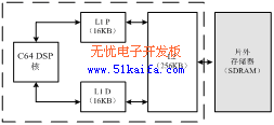 (1)存儲(chǔ)結(jié)構(gòu):DM642的存儲(chǔ)器系統(tǒng)由片內(nèi)內(nèi)存L1、L2和片外外存兩部分組成,L1,L2和片外SDRAM構(gòu)成了整個(gè)存儲(chǔ)器系統(tǒng)的三級(jí)層次結(jié)構(gòu),如圖2所示。其中,片內(nèi)內(nèi)存采用兩級(jí)緩存結(jié)構(gòu),第一級(jí)由L1P和L1D組成,L1距離DSP核最近,數(shù)據(jù)訪問(wèn)速度最快,只需一個(gè)時(shí)鐘周期,只能作為不能尋址的Cache使用。第二級(jí)L2是一個(gè)統(tǒng)一的程序/數(shù)據(jù)空間,可以整體作為SRAM映射到存儲(chǔ)空間,也可以整體作為第二級(jí)Cache,或是二者按比例進(jìn)行組合。第三級(jí)是片外外存,一般由SDRAM構(gòu)成。L1Pcache大小為16KB,直接映射,每行大小32