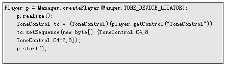 如果要播放序列音,則必須使用ToneControl。使用一個(gè)特別的定位器來(lái)創(chuàng)建一個(gè) Player對(duì)象,獲得ToneControl,設(shè)置其命令序列,然后啟動(dòng)播放器,如: