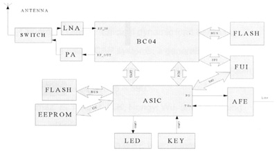 其中,BC04支持最大4個(gè)活動(dòng)連接(包括耳機(jī)),同時(shí)支持兩路SCO語(yǔ)音,所以語(yǔ)音通過PCM和ASIC PCM相接可以有多路被送到模擬端,從而實(shí)現(xiàn)3方通話。ASIC部分實(shí)現(xiàn)PCM語(yǔ)音數(shù)據(jù)與模擬語(yǔ)音信號(hào)的相互轉(zhuǎn)換,通過發(fā)送和接收PSTN信令,負(fù)責(zé)對(duì)人機(jī)界面的控制。它通過GPIO(General