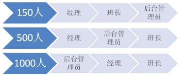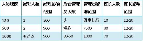 當(dāng)員工人數(shù)在150人的時(shí)候,班長往往有10位左右。經(jīng)理能有足夠的精力來兼顧全局,甚至和大部分員工認(rèn)識,親自制定關(guān)鍵流程和制度,參與每次的重要信息傳達(dá)。那么這個(gè)時(shí)候,經(jīng)理無疑是最為重要的管理者。班長是第二重要的,后臺管理員(質(zhì)檢、維護(hù)、投訴處理、綜合行政等)就更多是個(gè)執(zhí)行角色。