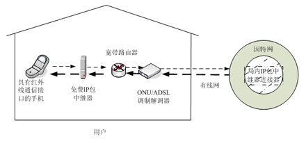 DoCoMo公司網(wǎng)里現(xiàn)有這類手機(jī)共37種),通過無線方式與免費IP包傳輸中繼器相連,免費IP包傳輸中繼器通過以太網(wǎng)經(jīng)過寬帶路由器或通過PPPoE(Point