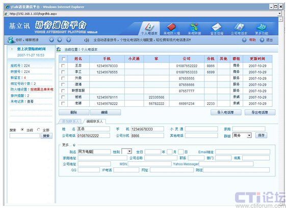電話本查詢功能允許員工從任何一臺(tái)電話機(jī)(企業(yè)內(nèi)部或者外部電話都可以)查詢自己的電話本中聯(lián)系人信息。該功能對于出差在外管理人員,緊急時(shí)如果要查詢某客戶資料信息特別有用。例如,可以查詢客戶姓名、電話號(hào)碼、地址等等。