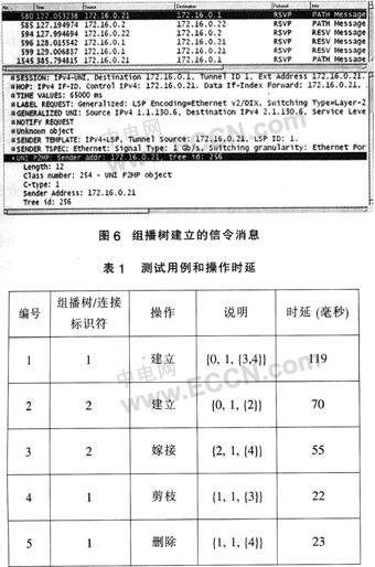 1出發(fā)的組播樹和單播連接,結(jié)果如表1所列。圖6顯示了Ethereal捕獲的組播樹建立的信令消息。在解開的Path消息中,可以發(fā)現(xiàn)經(jīng)過擴(kuò)展的UNI組播對象。然后,對已存在的連接進(jìn)行了動(dòng)態(tài)的修改。在第三個(gè)測例中,一個(gè)葉子被添加到單播連接上并使其變?yōu)橐豢媒M播樹。在嫁接和剪枝的操作中,業(yè)務(wù)生成器在已建立的連接上沒有觀察到丟包的現(xiàn)象。