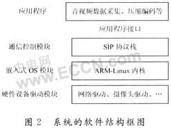 在系統(tǒng)硬件完成后,剩下的需要大量丁作來編寫代碼實(shí)現(xiàn)各個(gè)功能模塊,最終實(shí)現(xiàn)整個(gè)系統(tǒng)。系統(tǒng)的軟件結(jié)構(gòu)如圖2所示。嵌入式OS是采用ARM-Linux內(nèi)核,硬件驅(qū)動(dòng)模塊主要是基于ARM