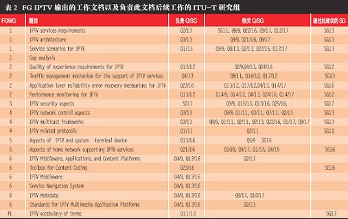 表2 FG IPTV 輸出的工作文檔以及負責(zé)此文檔后續(xù)工作的ITU-T
