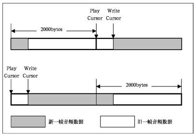從理論上講,這已經(jīng)保證了音頻回放的流暢性。但在實現(xiàn)過程中,由于操作的對象是一幀的音頻數(shù)據(jù),其回放的時間僅是0.25秒,所以必須考慮的一個問題是程序的反應(yīng)速度問題。如果忽略由事件觸發(fā)到真正用Lock函數(shù)鎖定緩沖區(qū)的部分以進行新數(shù)據(jù)寫入之間的時間,則這種實現(xiàn)方法沒有任何問題。除了最開始的兩幀數(shù)據(jù)外,新的一幀數(shù)據(jù)會緊跟在前一幀數(shù)據(jù)之后,彼此之間沒有重疊部分,也沒有空隙存在,能很好地達到音頻回放的流暢效果。但事實上,由事件觸發(fā)到真正用Lock函數(shù)鎖定緩沖區(qū)的部分以進行新數(shù)據(jù)的寫入之間還必須經(jīng)過線程監(jiān)聽到事件,分析事件對應(yīng)的緩沖區(qū),然后再觸發(fā)相應(yīng)的回調(diào)函數(shù)來進行