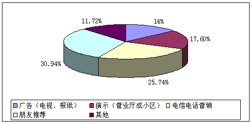 A、廣告(電視、報(bào)紙)(14%) B、演示(營(yíng)業(yè)廳或小區(qū))(17.6%) C、電信電話營(yíng)銷(25.74%) D、朋友推薦(30.94%)