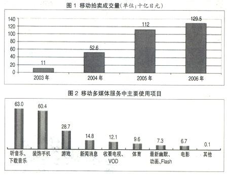 日本的在線購(gòu)物和拍賣市場(chǎng)起步較晚,但發(fā)展速度較快,用戶的認(rèn)知度也比較高,有41%~48%的移動(dòng)互聯(lián)網(wǎng)用戶使用過(guò)該項(xiàng)業(yè)務(wù)。十幾歲到二十幾歲的女性較傾向于使用該業(yè)務(wù)。2006年移動(dòng)拍賣的成交量為1295億日元,占到了通過(guò)手機(jī)在線購(gòu)買成交量的1/2(見圖1)。