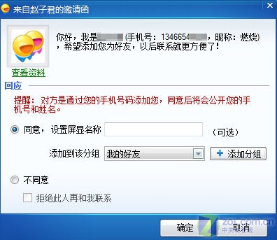 在圖3中,用戶在確認好友發(fā)來的信息時,為避免好友過多而忘記對方的身份,可以直接在上圖中增加類似QQ和MSN的“備注信息”,也即“屏顯名稱”。
