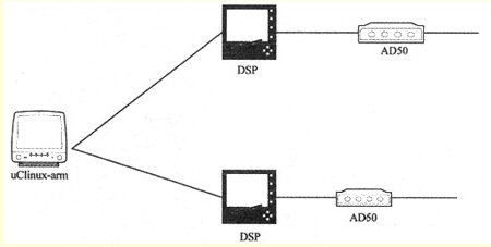 下一代媒體網關系統主要由媒體網關、媒體網關控制器和信令網關組成,實現了功能上的分解。為了適應不同的網絡,本文主要介紹了媒體網關的實現方法,其中媒體網關的主要作用是實現模擬信號由電路交換轉換成數字信號PCM編碼,并進行G.711或者G.723等格式編碼。為了實現媒體網關,整個系統由3部分組成,包括基于ARM架構的嵌入式系統(uClinux)、語音信號轉換芯片(TLC320AD50)和定點數字信號處理器(TMS320VC54xx),如圖3所示。