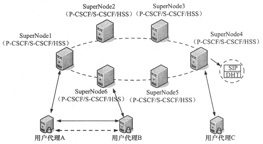 在分布式IMS架構(gòu)中,每一個SuperNode都包含兩類功能:基于DHT的HSS功能和基于SIP的會話控制功能;赟IP的會話控制功能包括P-CSCF功能和S-CSCF功能,P-CSCF為用戶代理接入到系統(tǒng)中的入口點,S-CSCF扮演歸屬地會話控制的角色。P-CSCF和S-CSCF的功能和3GPP