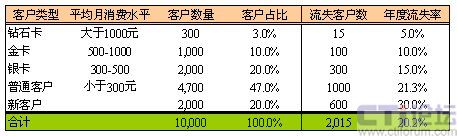因?yàn)楦叨丝蛻粼诶麧?rùn)貢獻(xiàn)中所起的巨大作用,通過(guò)簡(jiǎn)單的計(jì)算即可得出,每一名鉆石卡客戶流失帶來(lái)的利潤(rùn)損失,相當(dāng)于9.4名銀卡客戶流失帶來(lái)的損失,或相當(dāng)于50名普通客戶流失帶來(lái)的損失,或相當(dāng)于125名新用戶流失帶來(lái)的直接損失。