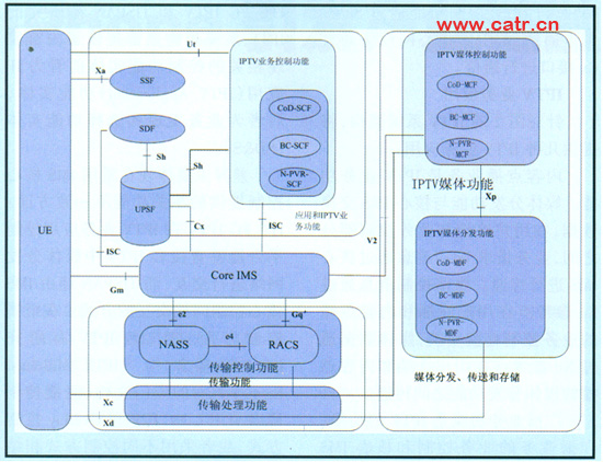 Release 1的研究成果上,其中包含了已有的NASS和RACS子系統(tǒng),并適當(dāng)加入與IPTV相關(guān)的網(wǎng)絡(luò)功能實(shí)體來實(shí)現(xiàn)對IPTV業(yè)務(wù)的擴(kuò)展。(如圖2所示)