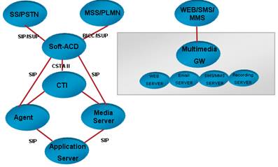 目前市場(chǎng)最常見的第三代呼叫中心是傳統(tǒng)的基于TDM的呼叫中心,應(yīng)用了計(jì)算機(jī)電話集成(CTI)技術(shù)。隨著網(wǎng)絡(luò)的普及和NGN的發(fā)展,出現(xiàn)第五代呼叫中心NGCC。NGCC是以NGN為基礎(chǔ)構(gòu)建的呼叫中心系統(tǒng),核心控制設(shè)備處理呼叫的能力較傳統(tǒng)呼叫中心大幅提高。NGCC的網(wǎng)絡(luò)架構(gòu)和接口如圖3所示。