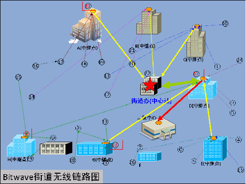 例如,遠(yuǎn)端地面點(diǎn)與主控中心有樓房、樹木等障礙物遮擋,Bitwave采用中繼的模式,在遠(yuǎn)端地面點(diǎn)和中心點(diǎn)都可視的高點(diǎn)建筑物上架設(shè)一收一發(fā)的兩臺BWB210無線網(wǎng)橋,通過功分器或交換機(jī)將遠(yuǎn)端點(diǎn)的信號傳送到中心點(diǎn),很好的解決了遠(yuǎn)端點(diǎn)與中心點(diǎn)不可視情況下鏈路無法搭建的問題。