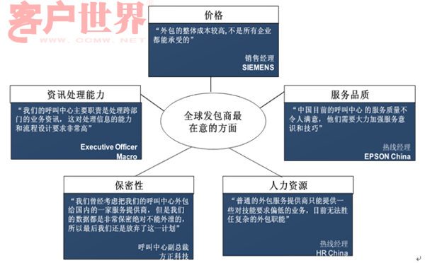經(jīng)過(guò)研究,我們發(fā)現(xiàn)全球發(fā)包商最在意五個(gè)方面:價(jià)格、服務(wù)品質(zhì)、人力資源、保密性和咨詢處理能力。