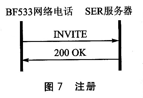 注冊過程如圖7所示。BF533網(wǎng)絡(luò)電話和SER服務(wù)器共交換了兩條消息:一條是目標(biāo)系統(tǒng)向服務(wù)器發(fā)送的REGISTER請求消息,另一條是服務(wù)器發(fā)送的200
