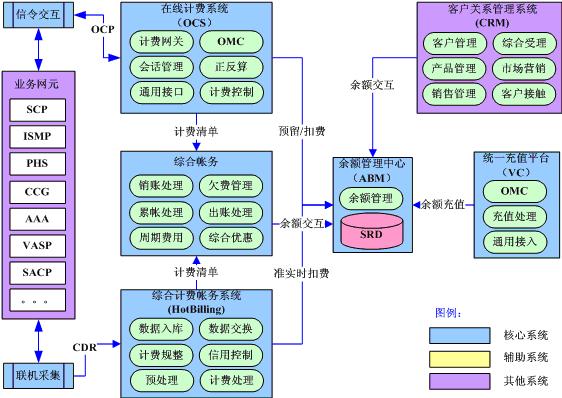 在線計(jì)費(fèi)系統(tǒng)通過實(shí)時(shí)信令交互實(shí)現(xiàn)對高風(fēng)險(xiǎn)和高價(jià)值業(yè)務(wù)的實(shí)時(shí)計(jì)費(fèi);綜合計(jì)費(fèi)帳務(wù)系統(tǒng)通過準(zhǔn)實(shí)時(shí)話單采集實(shí)現(xiàn)對后付費(fèi)用戶的準(zhǔn)實(shí)時(shí)計(jì)費(fèi);綜合帳務(wù)系統(tǒng)實(shí)現(xiàn)全業(yè)務(wù)的綜合優(yōu)惠和帳務(wù)處理;獨(dú)立的余額管理中心實(shí)現(xiàn)對電信余額的統(tǒng)一管理,未來將成為電信的“內(nèi)部銀行”;統(tǒng)一充值平臺實(shí)現(xiàn)全網(wǎng)全業(yè)務(wù)的統(tǒng)一充值支付。