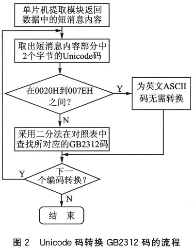 單片機通過串口與模塊連接后,發(fā)送讀取第一條新短消息指令:“AT+CMGR=1”。提取模塊接收的短消息后,先判斷其內(nèi)容是否為ASCII碼。若為ASCII碼,則無需轉(zhuǎn)換直接讀;否則,通過查表法查找其對應的漢字GB碼,實現(xiàn)不同編碼間的轉(zhuǎn)換。轉(zhuǎn)換流程如圖2所示。