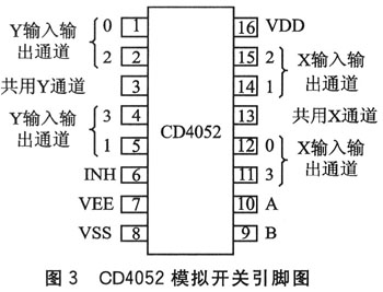 51系列單片機一般只有一個串行通路,通過串口與GSM模塊連接后,則不能再連接其他串口設備;而一些串口擴展芯片成本較高,連接也較麻煩。本方法利用數(shù)控模擬開關(guān)CD4052來做多串口擴展器,成本低廉而且接線簡單。其引腳排列如圖3所示。