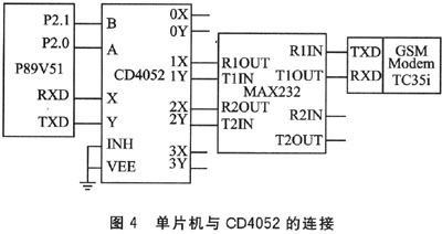 本設計中,A、B分別占用P2.0和P2.1口,P2=0x01則選通模塊串口,P2=0x02則接通其他串口設備。當INH為1時,所有通道均關(guān)閉。X、Y分別連接單片機的RXD和TXD,則可將一個串口擴展為4個,具體接線方法如圖4所示。