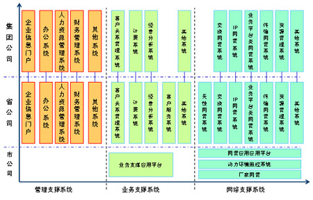 從系統(tǒng)的部署來看,主要集中在集團與省公司,其中,集團公司系統(tǒng)主要具備面向全公司的企業(yè)管理、經營分析等功能;省公司從以職能管理為主逐步轉變?yōu)橐陨a管理為主,具有了越來越多的生產職能,在運營支撐系統(tǒng)建設中的作用更加突出;市公司的生產管理職能有所削弱,將主要負責市場的具體營銷、客戶支撐以及設備的現(xiàn)場維護等工作。現(xiàn)有系統(tǒng)主要存在以下幾個問題:
