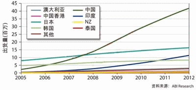 圖1:根據(jù)國家和地區(qū)細(xì)分的2005年到2012年亞太區(qū)家庭網(wǎng)絡(luò)發(fā)展趨勢(shì)
