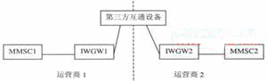 為實現(xiàn)不同運營商的用戶之間相互發(fā)送和接收多媒體消息,需要在不同運營商的多媒體消息中心之間實現(xiàn)互通。該互通需要多媒體消息中心(MMSC)與互通設(shè)備(IWGW)的連接、IWGW之間的連接實現(xiàn)。當一個運營商的網(wǎng)絡(luò)用戶向另一個運營商的網(wǎng)絡(luò)用戶發(fā)送多媒體消息時,該多媒體消息經(jīng)發(fā)送方用戶歸屬的MMSC通過IWGW提交給接收方用戶歸屬的多媒體消息中心,由接收方用戶歸屬的MMSC向其網(wǎng)內(nèi)用戶發(fā)送。網(wǎng)間多媒體消息業(yè)務(wù)互通網(wǎng)絡(luò)結(jié)構(gòu)中主要包括多媒體消息中心(MMSC),互通設(shè)備(IWGW)以及相關(guān)的輔助設(shè)備等。IWGW是指不同運營商網(wǎng)絡(luò)之間的多媒體消息互通設(shè)備。網(wǎng)間多媒體消息互通設(shè)備間的互聯(lián)可以由兩個運營商的IWGW直接連接,也可以經(jīng)過第三方互通設(shè)備轉(zhuǎn)接(見圖1、圖2)。