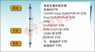 圖1顯示了IP-STB必須以連通性和匯聚設備的綜合為準繩來進行市場分類。不過也有一些其它的方法來進行定義,發(fā)展的趨勢是能夠在任何時間/任何地方都能提供生動的用戶體驗設備。