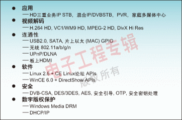 這確保了在HD屏幕上顯示SD內(nèi)容的圖像質(zhì)量。此外,NXP的開發(fā)平臺支持圖2所示的所有技術和應用。NXP提供兩個專用平臺:用于MPEG-2-HD、SD H.264、WM9、AVS的STB810平臺和用于HD H.264 a和VC1的STB225平臺。IP-STB平臺應該提供一個驗證核技術,例如NXP公司基于Nexperia技術的平臺,并且每一個研發(fā)工具都向后兼容。