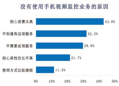 諾達咨詢對沒有使用手機視頻監(jiān)控的用戶原因進行調查,結果表明,43%的用戶擔心資費太高,其次對手機監(jiān)控不了解和不需要此項服務的用戶各占32%、30%。22%的用戶擔心性價比不高,12%用戶因為使用比較麻煩而不選擇手機視頻監(jiān)控服務。