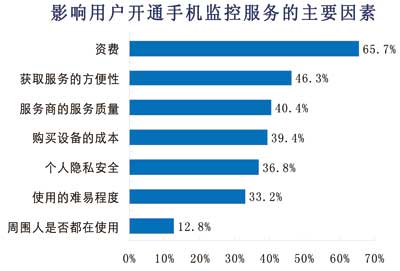 諾達咨詢進一步對用戶開通手機監(jiān)控服務的主要考慮因素進行調查,結果表明,最重要的因素為資費,有66%的用戶認為資費是重要的考慮因素。其次,46%的用戶認為獲取服務的方便性(即業(yè)務辦理流程)是影響用戶開通手機監(jiān)控業(yè)務的重要因素。其他,包括服務商的質量保障、設備成本、隱私安全和使用難易度對用戶也有一定的影響,但是影響較小。