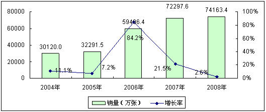 在中國移動用戶快速增長的直接帶動下,中國移動通信卡市場規(guī)模也迅速擴大,此外,基于用戶網(wǎng)間、網(wǎng)內(nèi)換號以及SP業(yè)務(wù)的蓬勃發(fā)展也為中國移動通信卡市場的快速增長注入動力。2004年到2008年,中國移動通信卡市場銷量規(guī)模從3.0億張急劇增長到7.4億張,四年年均復(fù)合增長率達(dá)到25.3%,移動通信也成為中國智能卡應(yīng)用的最大市場。