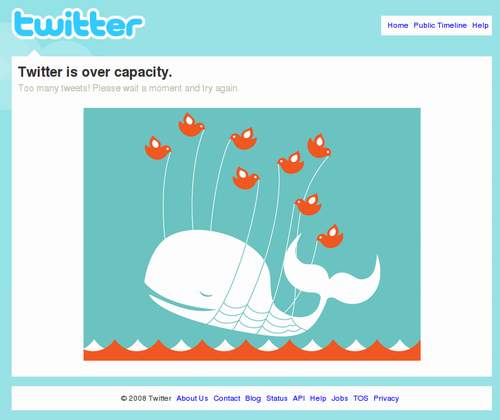 當Twitter宕機或者訪問量超過負荷時,用戶會被導向一個顯示有“失落的鯨魚”的頁面