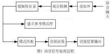 不同的人所發(fā)的語音信號,其模式有很大的差異,即使是同一個人,在不同的時間由于方法不同,其語音特征參數(shù)也有變化。在模式匹配時,由于這些變化會影響測度的估計,從而識別率降低。為了提高識別率,首先要把語音信號的起始點檢測出來;其次,為了克服兩次同樣的語音而發(fā)音時間長短的不同,采用對標準模式的語音信號均勻地伸長或縮短直到它與未知語音信號長度相一致。這種方法能達到的識別精度完全取決于端點檢測的精度。