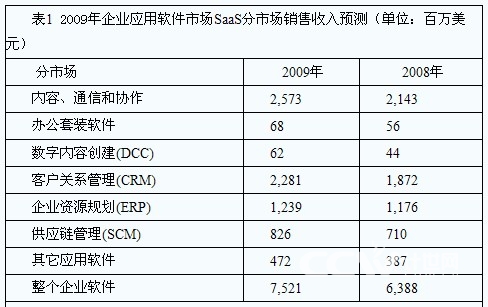 在Gartner的統(tǒng)計中,SaaS領域中,除了CRM之外,內容、通訊和協(xié)作市場同樣表現不俗,在2009年,這一市場的銷售收入將從2008年的21.4億美元增長到26億美元,甚至超過了CRM分市場的23億美元。其他如ERP分市場等同樣占據不小的份額。