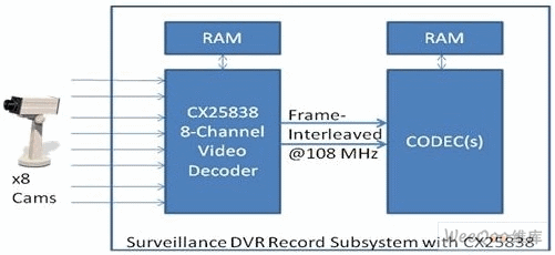 為了應(yīng)對這個挑戰(zhàn)并降低集成成本,科勝迅系統(tǒng)公司新近推出8通道視頻解碼器CX25838和CX25858,可提供幀交錯輸出并與監(jiān)控DVR中普遍使用的編解碼器兼容。圖2顯示了當(dāng)帶有幀交錯輸出的CX25838
