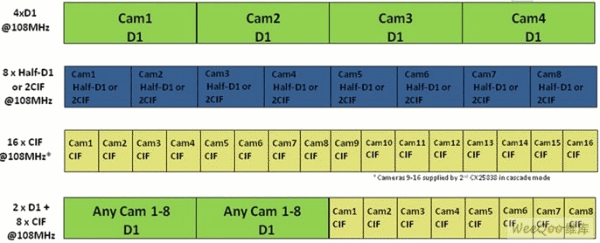 CX25838為監(jiān)控DVR設(shè)計人員提供機會,通過提供幀交錯數(shù)據(jù)實現(xiàn)編解碼器效率最大化,而不采用昂貴的FPGA或可編程邏輯。它還通過提供各種分辨率和幀速率,在一系列產(chǎn)品*享系統(tǒng)架構(gòu),提供規(guī)模優(yōu)勢的能力。例如,低成本DVR可采用一個編解碼器以全幀速率壓縮16個CIF分辨率通道,這可通過一條8位總線實現(xiàn)。其他解決方案可能需要每個編解碼器以全幀速率壓縮4個D1分辨率通道。還有些可能需要降低幀速率的D1