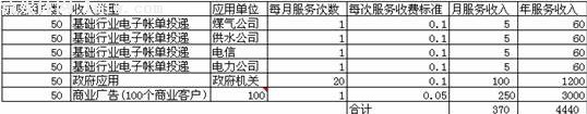 那么如果一家運營商已經(jīng)設(shè)計出了符合市場需求的業(yè)務(wù)模式,未來的盈利前景將會怎樣呢?不妨讓我們模擬分析一下。假設(shè)一個運營商擁有50萬左右的城市家庭用戶。在基礎(chǔ)行業(yè)領(lǐng)域,每月可以幫助煤氣、供水、電信和電力公司各發(fā)送1次賬單;在商業(yè)客戶方面,擁有百家左右的合作伙伴,每月每家合作伙伴發(fā)送1條短信廣告;在政府機關(guān)領(lǐng)域,粗略估算政府機關(guān)每月總計使用20次左右;每個家庭用戶則每月收到電信短信約125條。假設(shè)運營商的服務(wù)資費中,除了商業(yè)廣告為0.05元/條外,均為0.1元/條。那么,盈利情況又該怎樣呢?