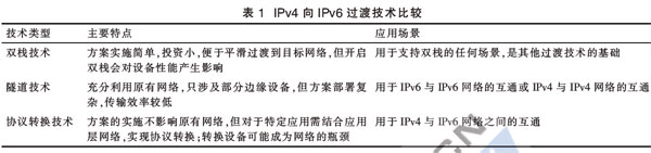 目前,主要的過(guò)渡技術(shù)有雙棧技術(shù)、隧道技術(shù)和協(xié)議轉(zhuǎn)換技術(shù)等。雙棧技術(shù)就是在設(shè)備上同時(shí)安裝IPv4和IPv6協(xié)議棧,應(yīng)用程序根據(jù)DNS解析地址類型選擇使用IPv6或IPv4;隧道技術(shù)有多種實(shí)現(xiàn)方式,主要將IPv6報(bào)文作為IPv4的凈荷,實(shí)現(xiàn)IPv6孤島之間的互聯(lián),或者以相反方式實(shí)現(xiàn)IPv4孤島之間的互聯(lián);協(xié)議轉(zhuǎn)換技術(shù)通常應(yīng)用在IPv6和IPv4網(wǎng)絡(luò)的交界處,實(shí)現(xiàn)IPv6主機(jī)與IPv4主機(jī)之間的互通。