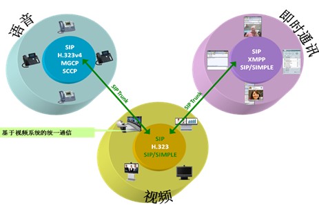 所有的視頻系統(tǒng)采用H.323/SIP方式獨(dú)立存在,網(wǎng)絡(luò)層采用SIP協(xié)議和即時通訊、語音等進(jìn)行連接,這樣就可以克服視頻終端遷移帶來的種種弊端。這樣做的前提條件,是要在視頻系統(tǒng)里部署一個視頻通訊服務(wù)器,完成H.323/SIP的轉(zhuǎn)換,完成基于H.323/SIP的雙流和呼叫控制,而不是一個傳統(tǒng)的H.323的網(wǎng)守可以完成的功能。一個完整的基于視頻的統(tǒng)一通信系統(tǒng),只有采用這種方式,才可以實現(xiàn)真正的視頻系統(tǒng)、即時通信系統(tǒng)、語音系統(tǒng)的統(tǒng)一通信。