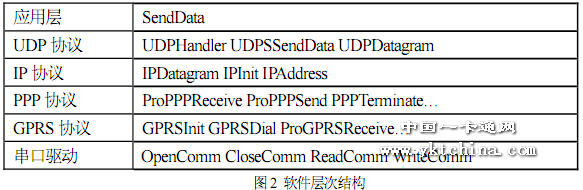 程序中的所有代碼都是由C 語(yǔ)言編寫(xiě)的,并采用分層的結(jié)構(gòu),從底到上分別為:串口驅(qū)動(dòng)層、GPRS 模塊驅(qū)動(dòng)層、PPP 協(xié)議層、IP 協(xié)議層、UDP 協(xié)議層與應(yīng)用層。上層函數(shù)的實(shí)現(xiàn)需要應(yīng)用到底層函數(shù),而底層函數(shù)的任務(wù)就是為上層函數(shù)提供服務(wù),最終完成應(yīng)用層任務(wù)——傳送數(shù)據(jù)。各層的主要函數(shù)如圖2 所示: