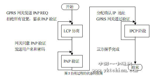 系統(tǒng)的一個(gè)難點(diǎn)是微控制器登陸 GPRS 網(wǎng)關(guān)(GGSN)并與網(wǎng)關(guān)通過(guò)LCP、PAP、IPCP 協(xié)議進(jìn)行協(xié)商的過(guò)程。LCP、PAP 與IPCP 協(xié)議的幀結(jié)構(gòu)大同小異,最常用的為請(qǐng)求(REQ)、同意(ACK)和拒絕(NAK)三種幀。微控制器與GGSN 各為一方進(jìn)行協(xié)商,任何一方都可以發(fā)送REQ 幀請(qǐng)求某方面的配制,另一方覺(jué)得配置不能接受會(huì)回應(yīng)NAK 幀,如果可以則回應(yīng)ACK 幀。為了節(jié)省資源,我們只處理這三種數(shù)據(jù)幀,其它鏈路問(wèn)題都由微控制器在程序控制下自己重新?lián)芴?hào)解決。協(xié)商過(guò)程大致描述如下:在撥號(hào)成功連接后,GGSN 首先會(huì)返回一個(gè)PAP REQ 數(shù)據(jù)幀。我們發(fā)送一個(gè)空 LCP REQ 幀,以強(qiáng)迫進(jìn)行協(xié)議協(xié)商階段。隨后,GGSN 發(fā)送LCP 設(shè)置幀,我們拒絕所有的設(shè)置并請(qǐng)求驗(yàn)證模式。GGSN 選擇CHAP 或PAP 方式驗(yàn)證,我們只接受PAP 方式。然后,進(jìn)行PAP 驗(yàn)證用戶名和密碼過(guò)程,在GPRS 中用戶名與密碼都為空,如果成功,GGSN 會(huì)返回IPCP報(bào)文分配動(dòng)態(tài)IP 地址。此時(shí),就完成了與GGSN 的協(xié)商過(guò)程。協(xié)商過(guò)程的狀態(tài)轉(zhuǎn)換如圖5 所示。