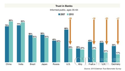 全球經(jīng)濟的垮臺在全球范圍內(nèi)嚴(yán)重?fù)p害了人們對銀行的信任。Edelman的報告表明自金融危機以來銀行業(yè)的信任度大幅下降,與之形成鮮明對比的是其它行業(yè)企業(yè)信任度的提升。