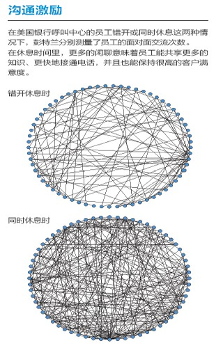 去年,彭特蘭的實(shí)驗(yàn)室與美國銀行(Bank of America)設(shè)在羅得島(Rhode Island)的呼叫中心合作,在80 名中心員工身上安裝了社會傳感器。這種傳感器看起來像一枚不顯眼的徽章,使用藍(lán)牙和紅外信號監(jiān)測實(shí)驗(yàn)對象每分鐘與哪些同事交談。測試活動先開展了一個月,后來又進(jìn)行了6周。第一個月后,實(shí)驗(yàn)室的研究人員發(fā)現(xiàn),與更多同事進(jìn)行過交談的員工能夠更快地接通電話,他們自我感覺的壓力也相對較小,而客戶滿意度卻與其他人一樣高。與刻板地遵循員工手冊或服從經(jīng)理的電子郵件指示相比,通過非正式的閑聊來交流問題和解決方案似乎能取得更好的結(jié)果。有了這種結(jié)論之后,該呼叫中心嘗試盡量將員工的休息時間安排在一起,而非像過去那樣錯開。這樣員工就有了更多的時間參與閑聊。幾個月后,美國銀行向?qū)嶒?yàn)室報(bào)告了結(jié)果:該呼叫中心獲得了相當(dāng)于每年1,500 萬美元的生產(chǎn)力提升。