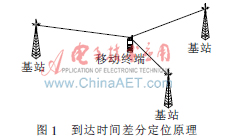 TDOA作為主要的定位技術在第三代移動通信網(wǎng)絡中得到了廣泛的應用。在3GPP的WCDMA中,基于TDOA定位技術,即觀測到達時間差分OTDOA(Observed Time Difference of Arrival);在3GPP2的CDMA2000中,稱為高級前向鏈路三角測量法A-FLT(Advanced Forward Link Trilateration)。這些方法的原理相同,都是通過信號到達時間差值,確定不少于兩條雙曲線,再通過這些雙曲線的交點,確定移動臺的位置。到達時間差分定位原理如圖1所示。